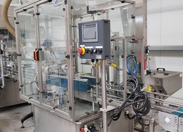 Ligne de bidons, sur lesquels on colle une étiquette, on remplit de produit et on visse un bouchon.
